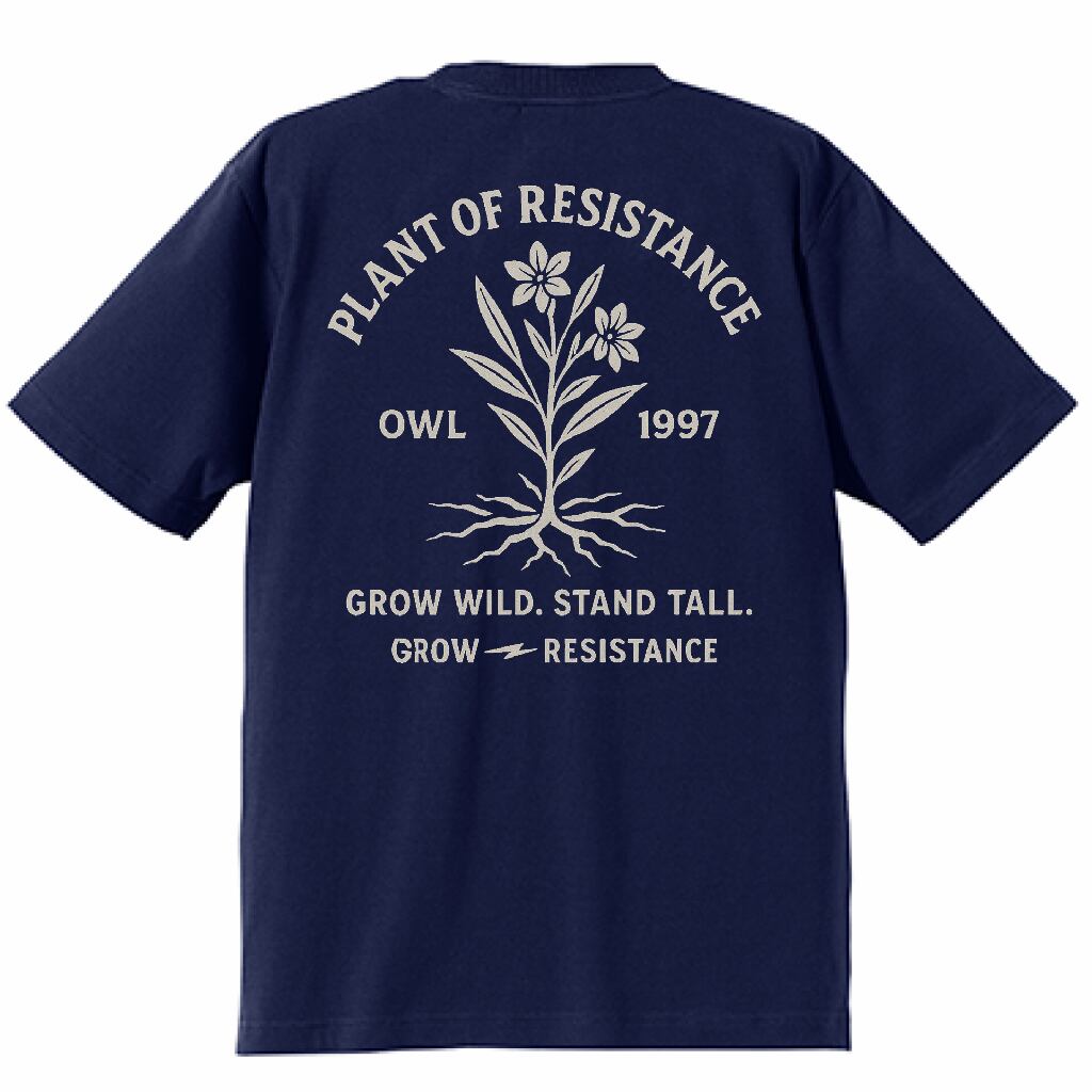 どんな環境でも根を張り、伸び上がる力強い生命を描いたOWL1997のメッセージTシャツ。